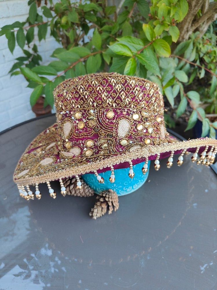 Dolly cowboy hat - recycled sari fabric Purple and gold