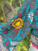 These are hand crafted in india by our friends and suppliers who use the phulkari work stitching...which is all hand sewn / embroidered...the meaning of phulkari means or translates to ornamental cloth with embroidered silk flowers.