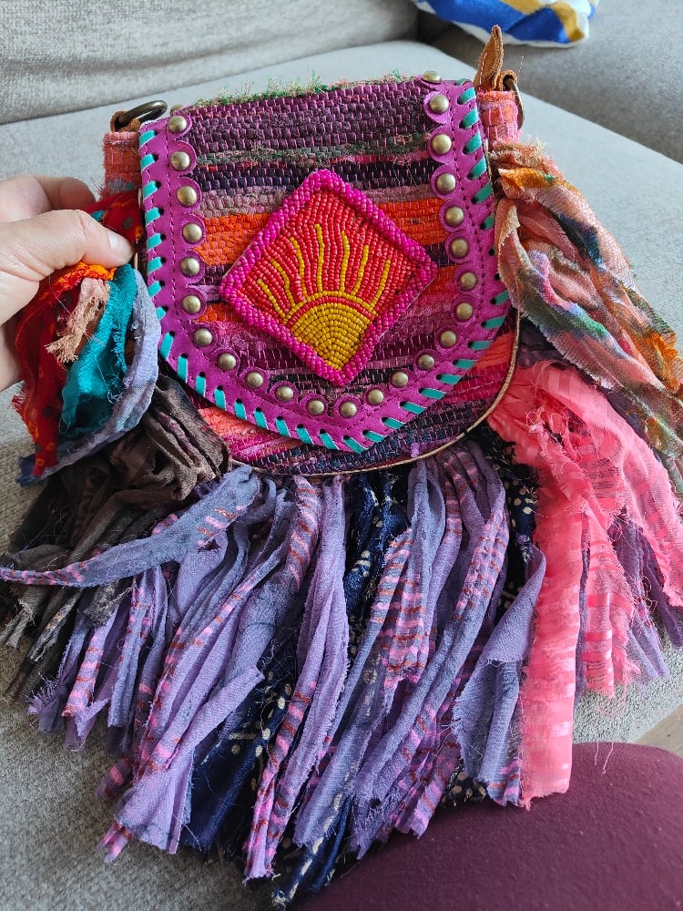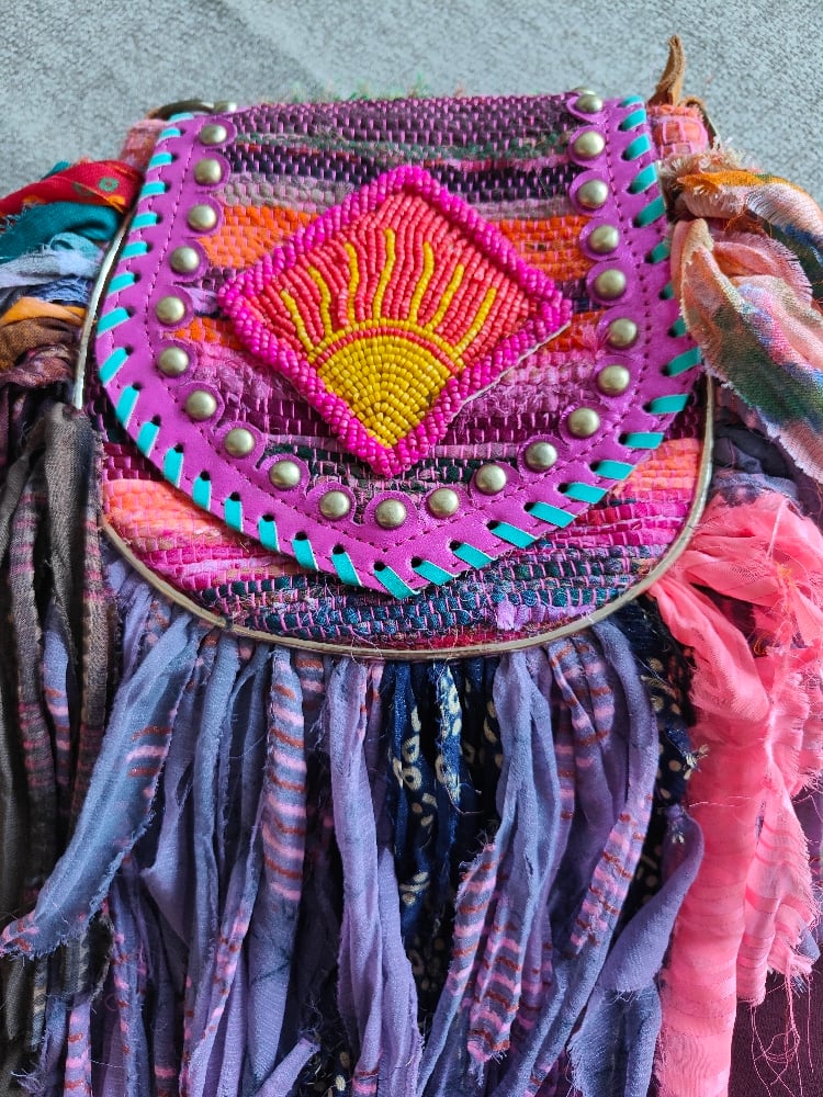 These bags are truly works of art, made from patchwork saris and then rag sari frills.